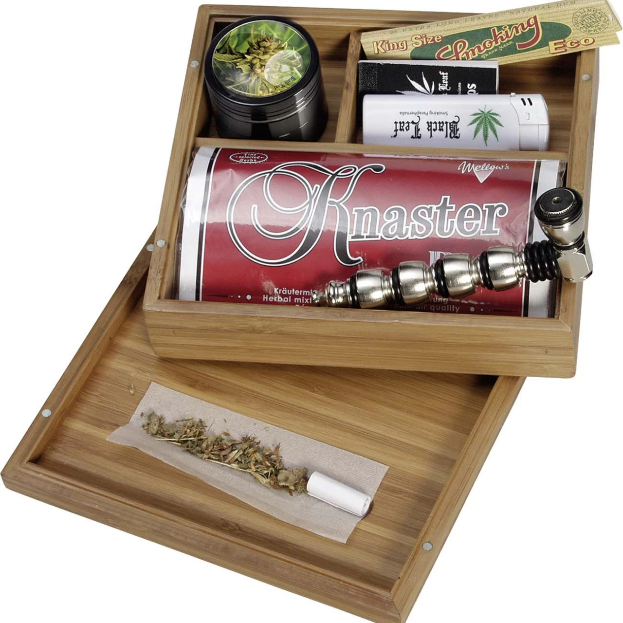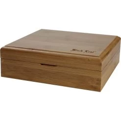 Black Leaf Bamboo Stoners Box. This Stoners joint rollers box from Black Leaf is made tough? Bamboo and comes with magnetic fasteners on each corner. And makes for an ideal compact storage of all ones smoke utensils. When flipped over the lid doubles and a perfect rolling surface. It comes with the Black Leaf logo etched into a metal name plate on the lid. Pictured contents not included!