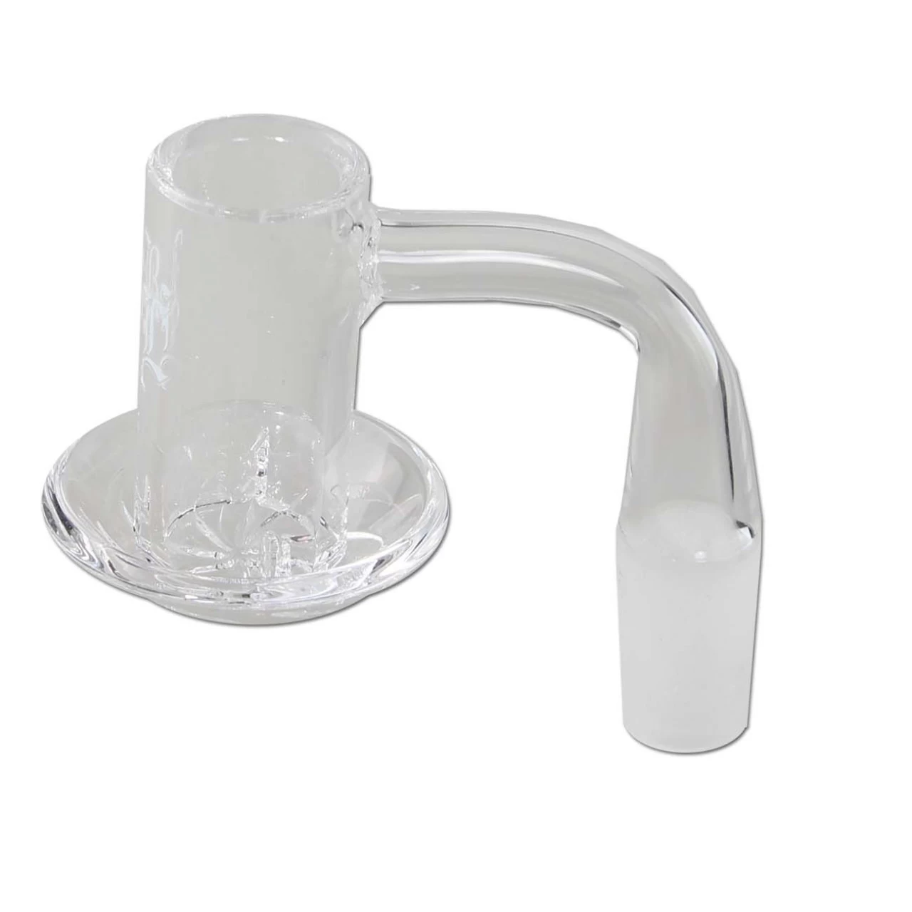 The plate of the banger is connected to the container by angled air slits so that the oil can flow up the walls and back into the plate. The evaporation takes place more evenly this way. It does not matter whether the extract is dabbed inside the banger or on the outside plate (to dab). As soon as the extract is dabbed onto the heated banger, it circulates in the banger until it has evaporated completely. Due to the whirlwind-like slits in the plate, this works particularly well here.