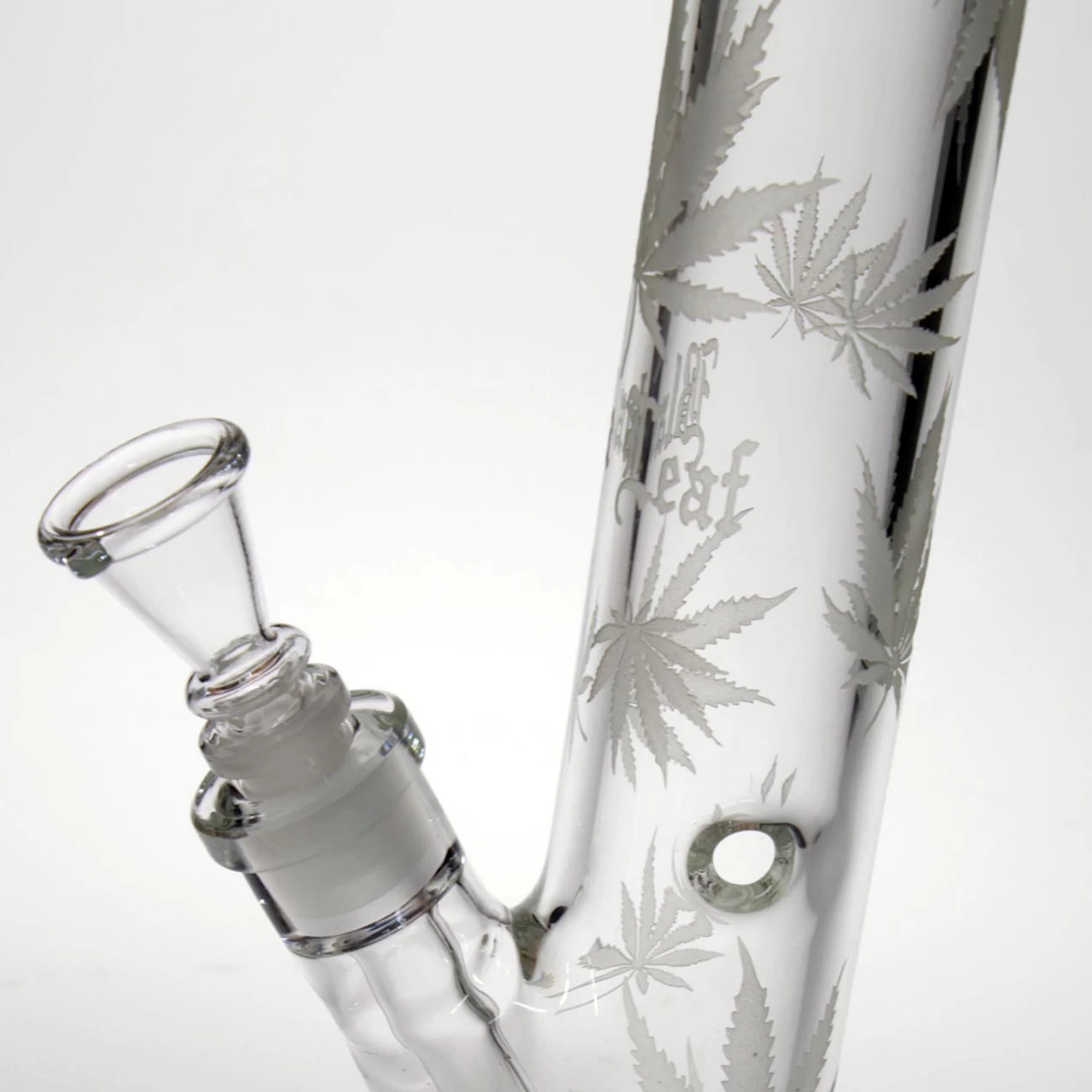 The ‘Hemp Leaf’ design of this classic cylindrical bong from Black Leaf was applied to the glass pipe by sandblasting. As a result, the subsequently applied luminescent lacquer is particularly long lasting. Even the wall thickness of strong 7mm promises a certain longevity of the glass bong, which can also be cleaned very well.
