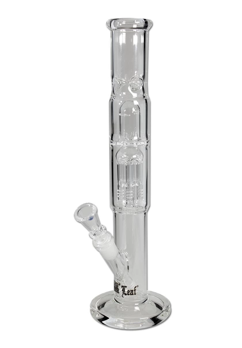 Heavy ‘Black Leaf’ glass bong with 6-arm percolator bong, splash guard and ice notches, two-part adapter with diffuser. Without Kickhole!