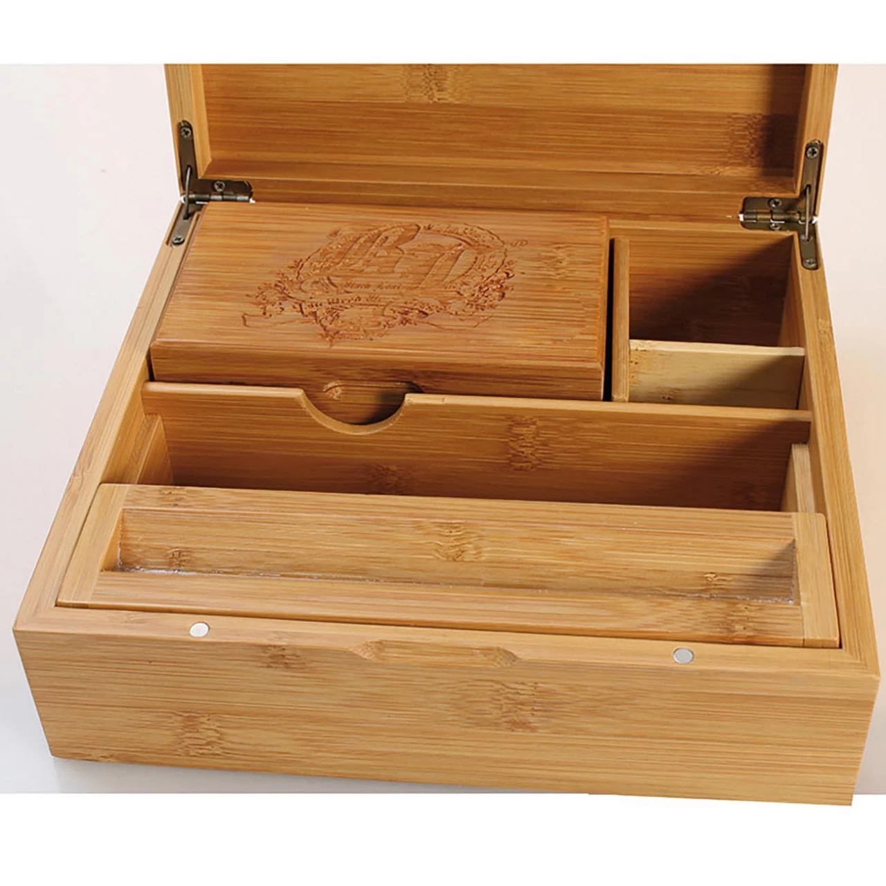 The Stoner Box II from ‘Black Leaf’ made of Bamboo with Skull design has everything the smoker’s heart desires: papers holder, grinder compartment, removable rolling form, separate pollen box with screen and naturally plenty of storage space. The lids of the Stoner Box II and pollen box are closed magnetically. The pollen box is made up of 3 parts. The lid can also be used as rolling base, but the removable rolling form is top. The middle part of the pollen box has a screen through which the pollen can fall on the black acrylic plate.