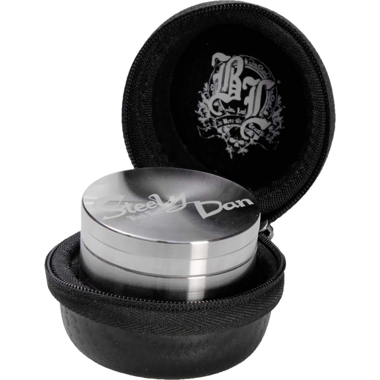 With this four-part grinder, the sieve chamber and the bottom chamber, where valuable herbal dust accumulates, are tightly and securely closed by a rotary seal. The enclosed small spatula helps to empty the budbreaker and collect the pollen dust. The ‘Steely Dan‘ is packed in a round casket with zipper and the ‘Black Leaf’ coat of arms on the inside of the lid.