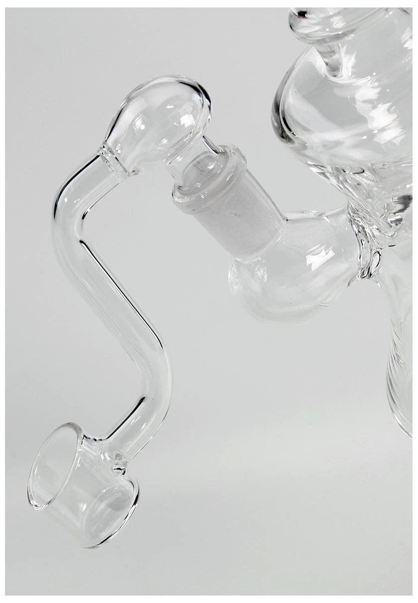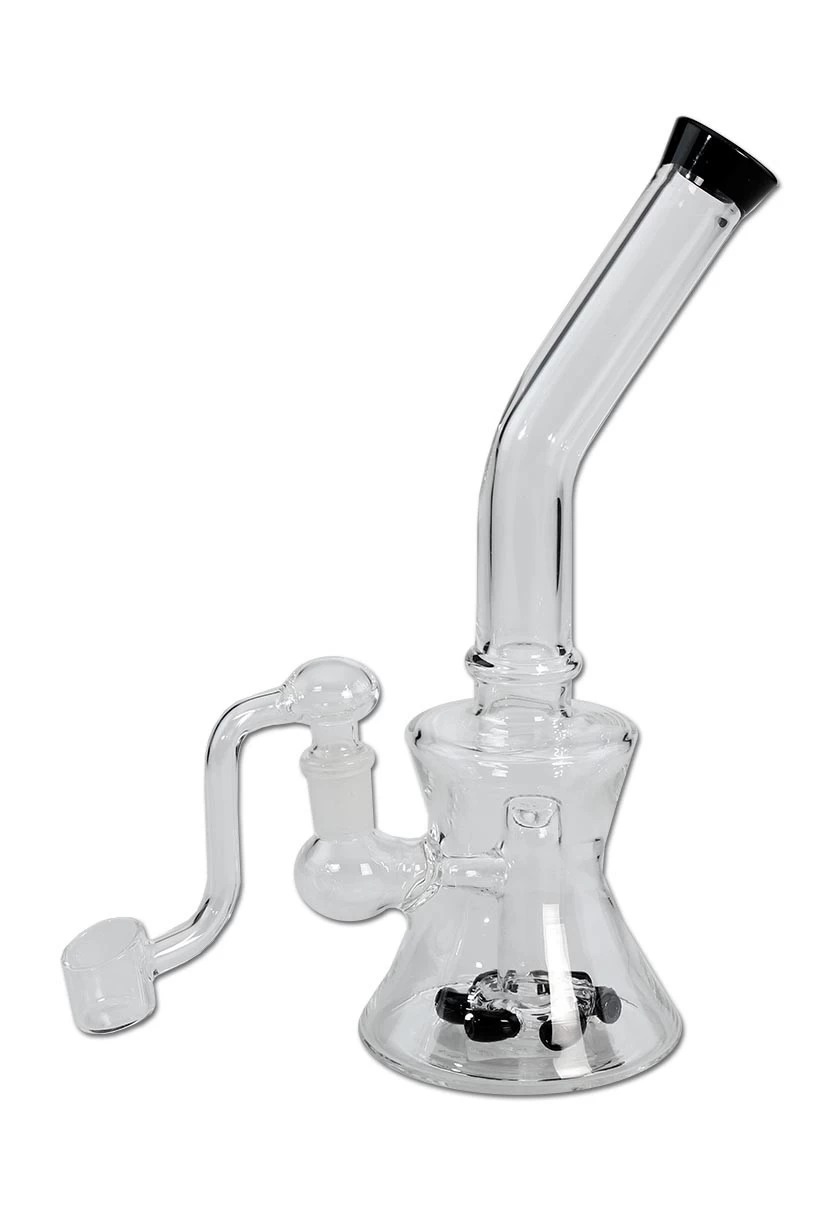 This steam turbine percolator bong is equipped with a banger that increases the distance between the hot oil pan and the water pipe so that one can work better with torch or dabbing tools. This way the glass body is protected against heat and you can see better where to place your dabber.